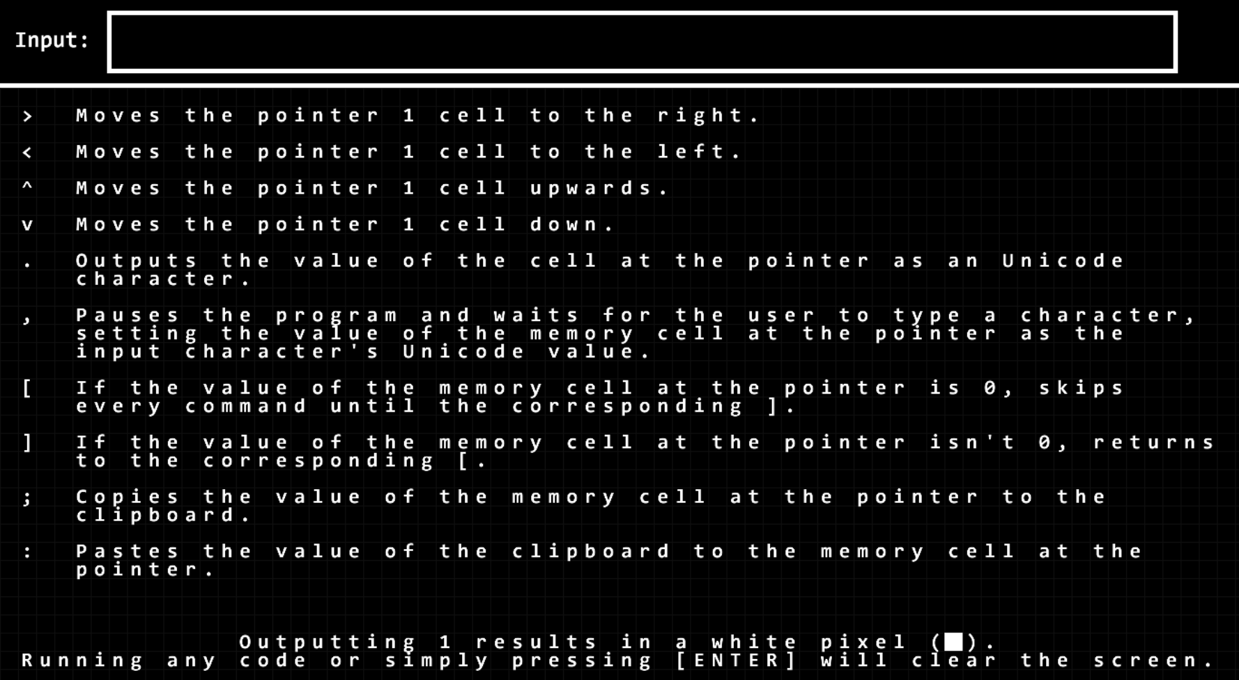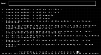| , | Pauses the program and waits for the user to type a character, setting the value of the memory cell at the pointer as the input character's Unicode value. |